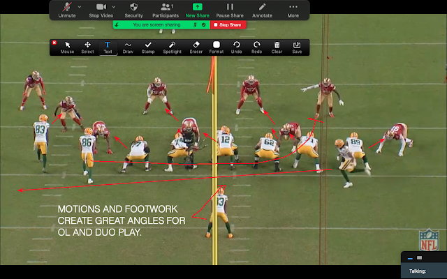 Matt LaFluer and the Green Bay offensive staff are very strong in their ability to use motions to their advantage in the run game. Like the 49ers offense they use shifts, motions, and arounds (post snap) to gain an advantage. There are three reasons why you would want to use motion in the run game: