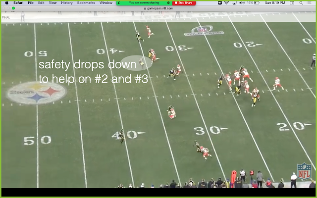 Protection call is fairly easy (4 man pressure shown, pre snap) Steelers only ever show 4/5 man pressure vs empty so they just make a right or left call for the center. They don't have to check or do anything special because the Steelers don't show 6 man pressure. Just look at the safeties in the picture. 2 high, Pre snap thinking